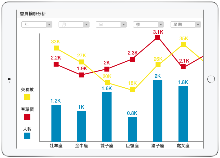 依照會員年齡、生日、星座、性別、區域等屬性,與交易數據進行交叉比對。