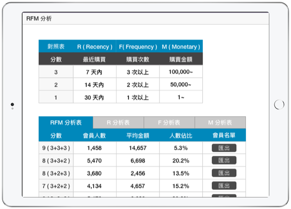 透過三個指標 Recency ( 最近購買時間 )、Frequency ( 交易頻率 )、Monetary ( 交易總額 ) 來分析會員交易數據。