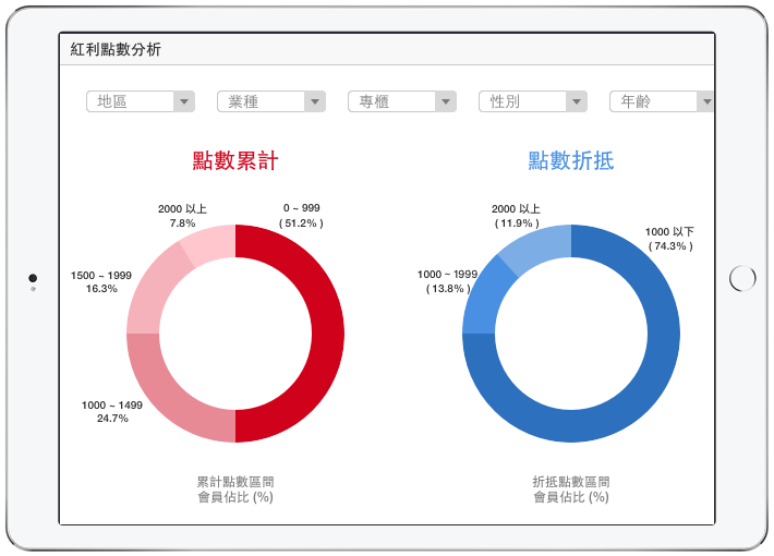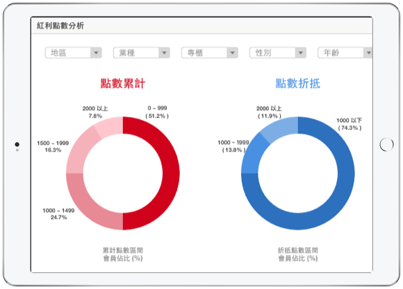 從圖表瞭解紅利點數累積額度與會員輪廓關係,還能知道點數用於那些專櫃、商品類別、縣市區域。