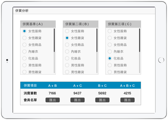 想知道同時買了服飾與化妝品的會員有哪些嗎?透過併買行為發掘消費關聯族群。