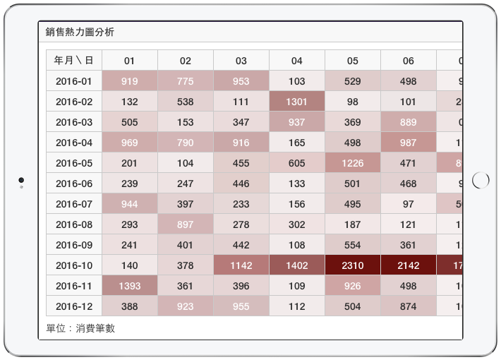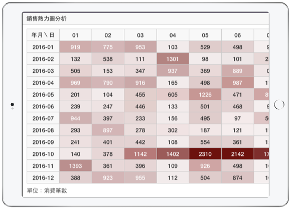 視覺化的銷售熱力圖表,讓您一眼看出業績高漲的熱門日期區段,協助您比對行銷檔期效益。