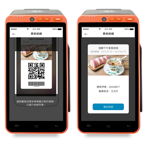 前後鏡頭搭配軟體辨識條碼,無論是一維條碼或是二維條碼,都能快速解讀;並可即時連線至票券系統進行查詢、核銷作業。