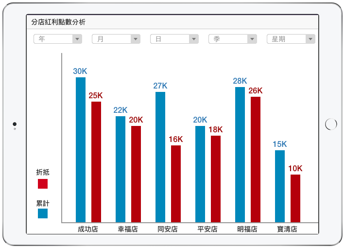 從圖表看出各店的紅利點數累積與折抵數據,還能進一步分析點數用於哪些業種或商品類別。
