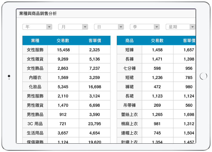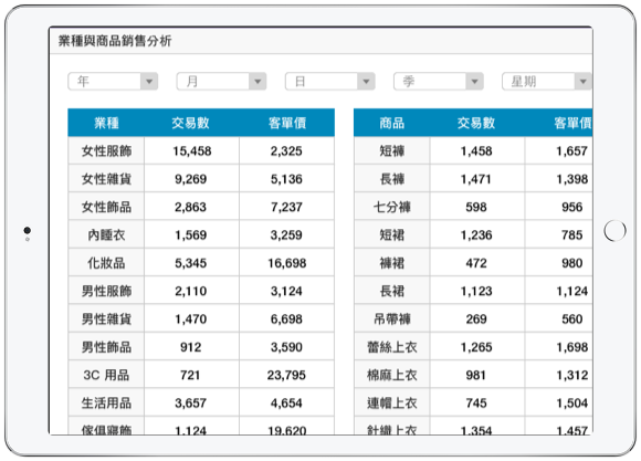 分店銷售熱力圖分析、分店紅利點數分析、業種與商品銷售分析等多項圖表,協助您用不同的視角剖析數據,看出分店 / 業種 / 商品與營收的關聯密碼!