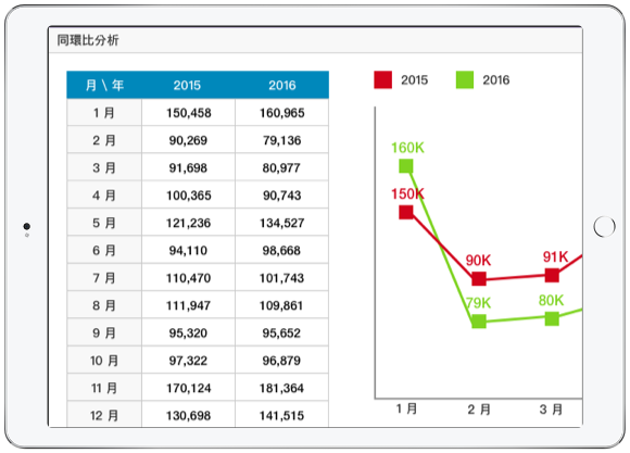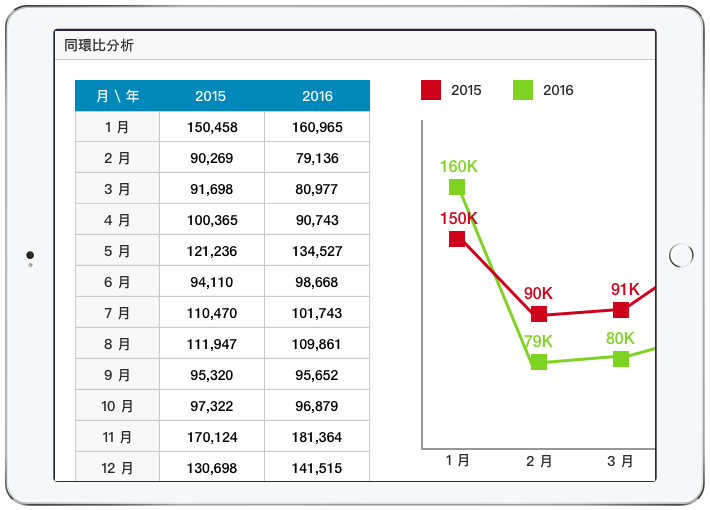 想與過去數年的同期業績想比?或是知道前後期的業績變化,透過同環比圖表迅速瞭解。